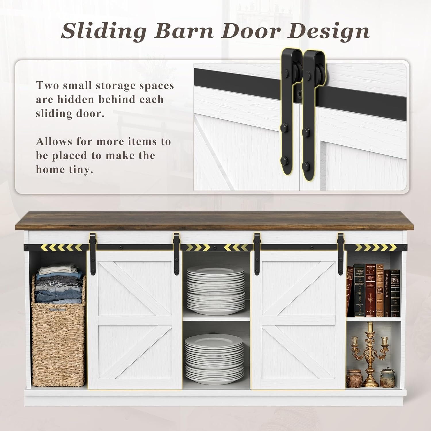 • Sliding Doors: Designed with rustic barn-style sliding doors, this model lets you cover or reveal the storage cabinet and central shelves, perfect for hiding clutter.