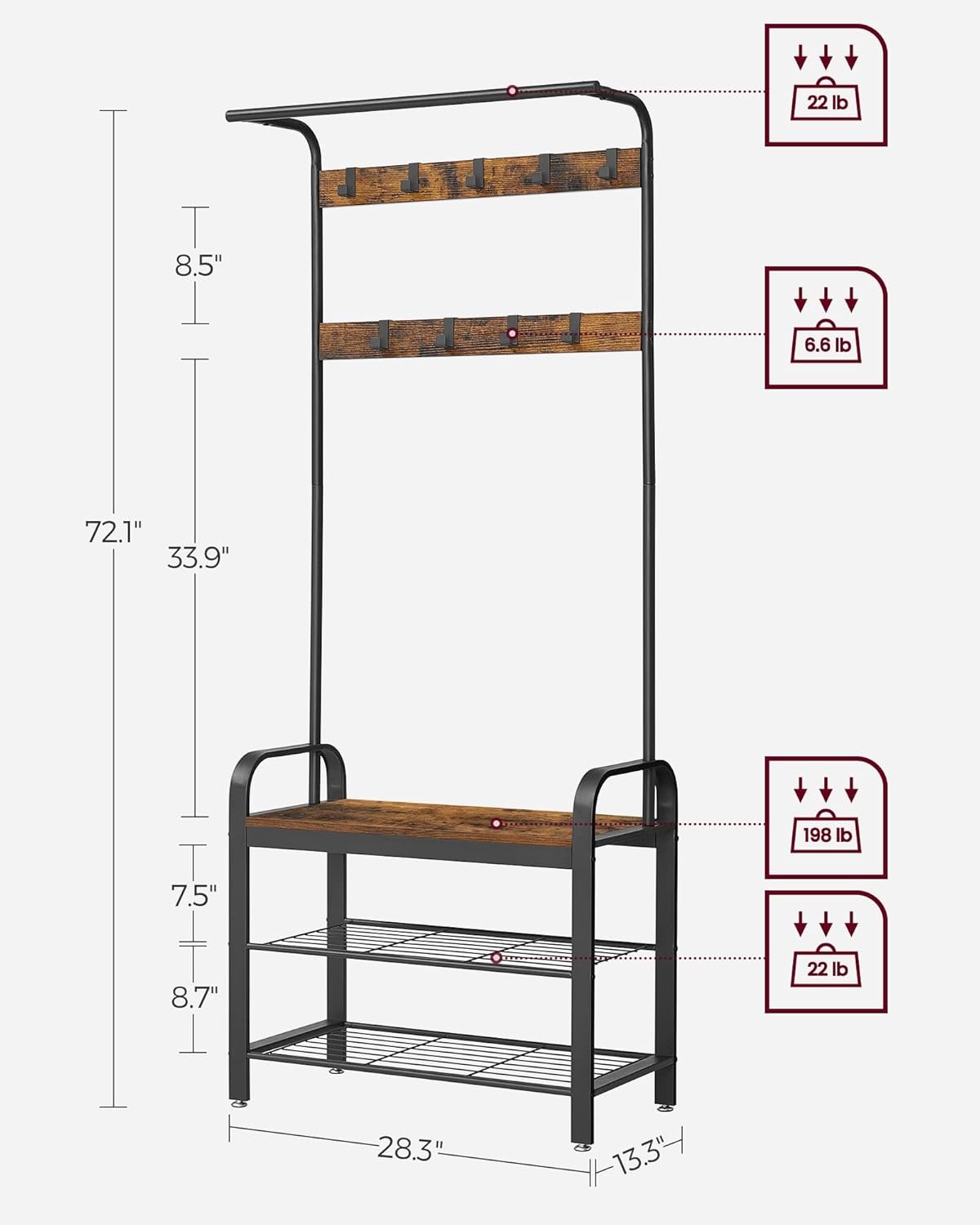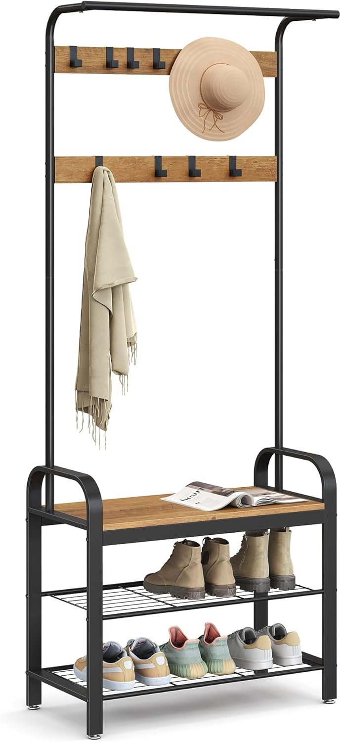 Upgrade your entryway with the VASAGLE Coat Rack, a versatile 4-in-1 hall tree combining a sturdy shoe bench, coat rack, hanging rod, and 9 removable hooks for ultimate convenience. Built with a robust steel frame and quality particleboard, this stylish rustic brown and black organizer supports up to 198 lb and offers flexible storage for coats, shoes, and accessories. Easy to assemble and thoughtfully designed for stability, it’s the ideal addition to keep your home neat and welcoming.