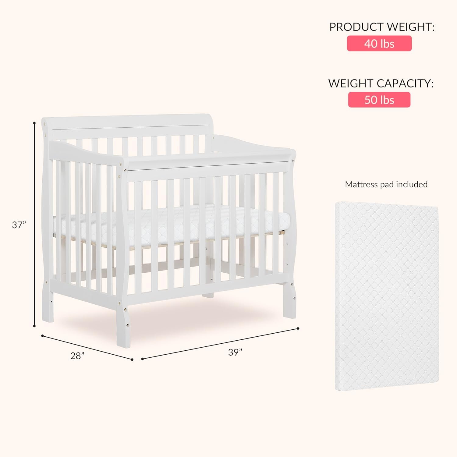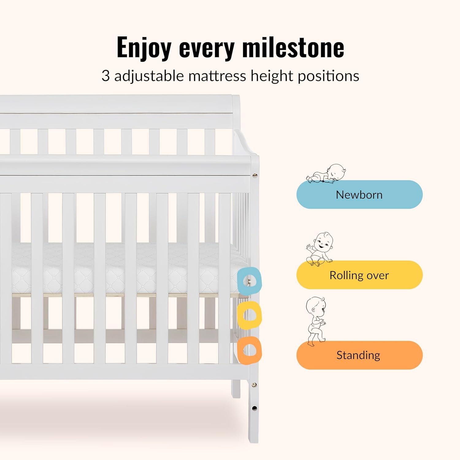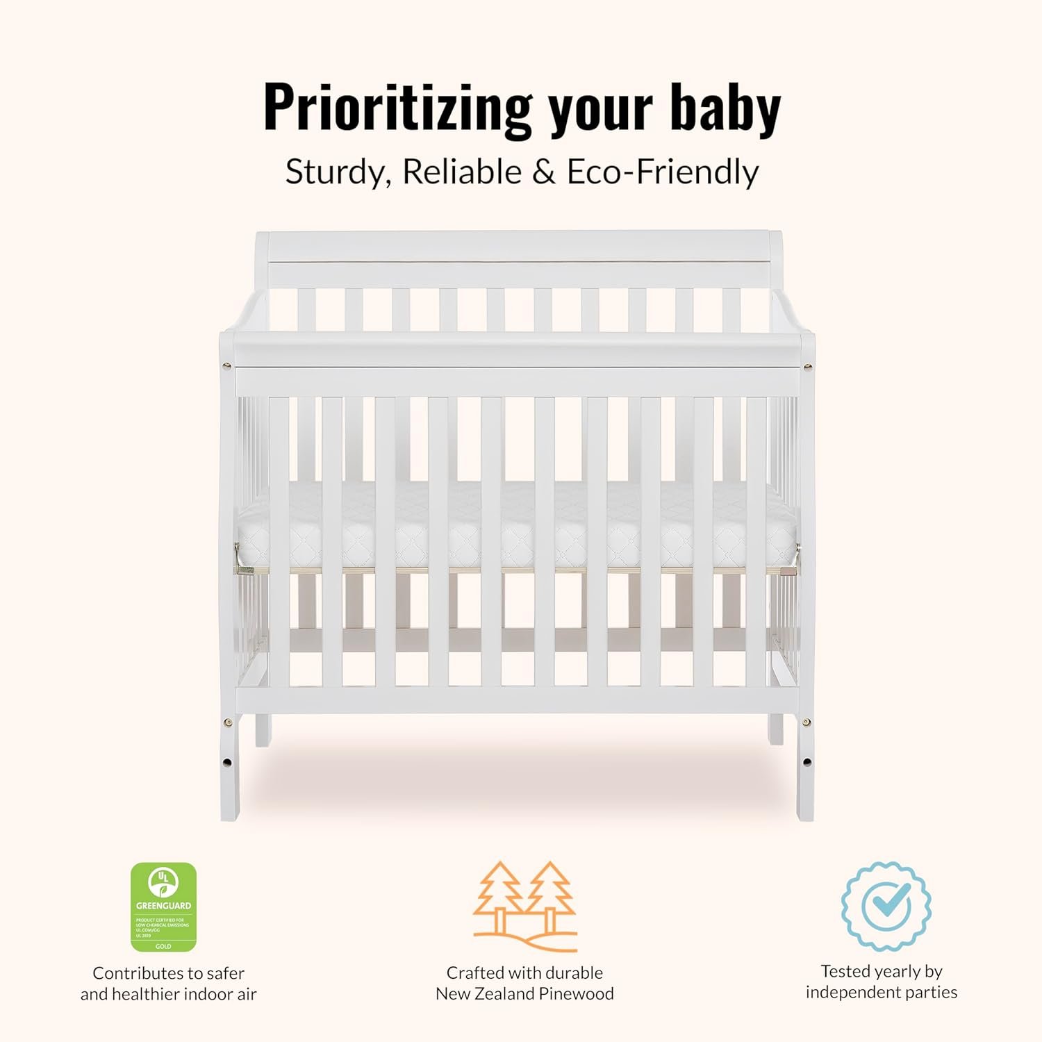 The Dream On Me Aden 4-in-1 Convertible Mini Baby Crib in White is a versatile, space-saving solution perfect for apartments or shared nurseries. Designed by Dream On Me, this sustainable pinewood crib easily converts from a mini crib to a daybed and even a twin-size bed, growing with your child for years of use. With Greenguard Gold, JPMA, and Baby Safety Alliance certifications, plus non-toxic finishes and adjustable mattress heights, it ensures both safety and style. This compact crib is an excellent choice for parents seeking durability, flexibility, and peace of mind—all in one chic package.