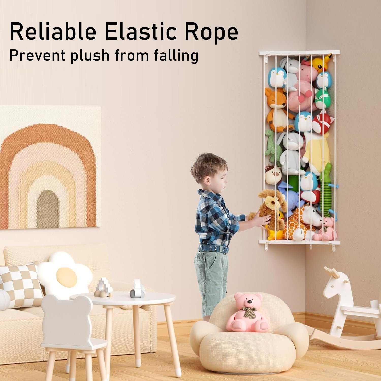 - Adjustable Large Capacity: Easily stretches the elastic cord up to 75 inches, accommodating plush toys of all sizes — making it a perfect animal organizer or toy organizer.